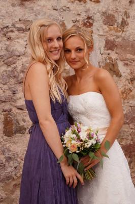 Mit Brautkleid im Gepäck kam ich schon leicht gestresst mit meinem Freund an. Schnell unser Zimmer beziehen und dann ab ins Brautzimmer, wo meiner Schwester schon Make-up und Haare gemacht wurden. Man merkte, dass sie schon aufgeregt war. Meine Mutter und ich sahen zu und unterhielten uns mit ihr, damit sie sich nicht verrückt macht. Zwischendurch mussten mein Freund und ich noch Ballons mit Helium füllen, die später steigen gelassen werden sollten. Dann kam der Moment, wo meine Schwester ihr Hochzeitskleid anzog. Während ich ihr half und es hinten schnürrte, machte die Fotografin schon Fotos. Als die wunderschöne Braut dann komplett fertig war, bewunderten wir sie und noch ein paar schöne Bilder wurden gemacht.